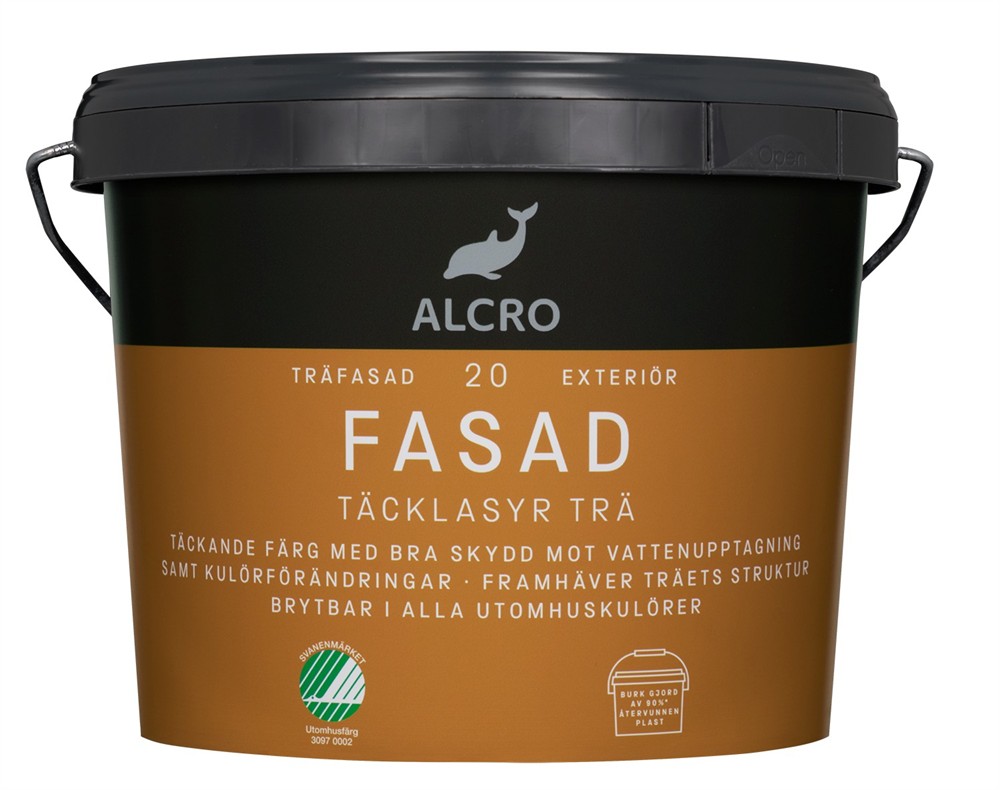Fasad Täcklasyr är täckande färg samtidigt som den framhäver träets struktur. Bindemedlet (alkyd-akrylathybrid) i kombination med linolja gör att färgen är lättstruken och ger bra vidhäftning till underlaget. Fasad Täcklasyr skyddar mot vattenupptagning, kulörförändring och kritning. Den passar för målning av husfasader, knutar, foder, staket och vindskivor.